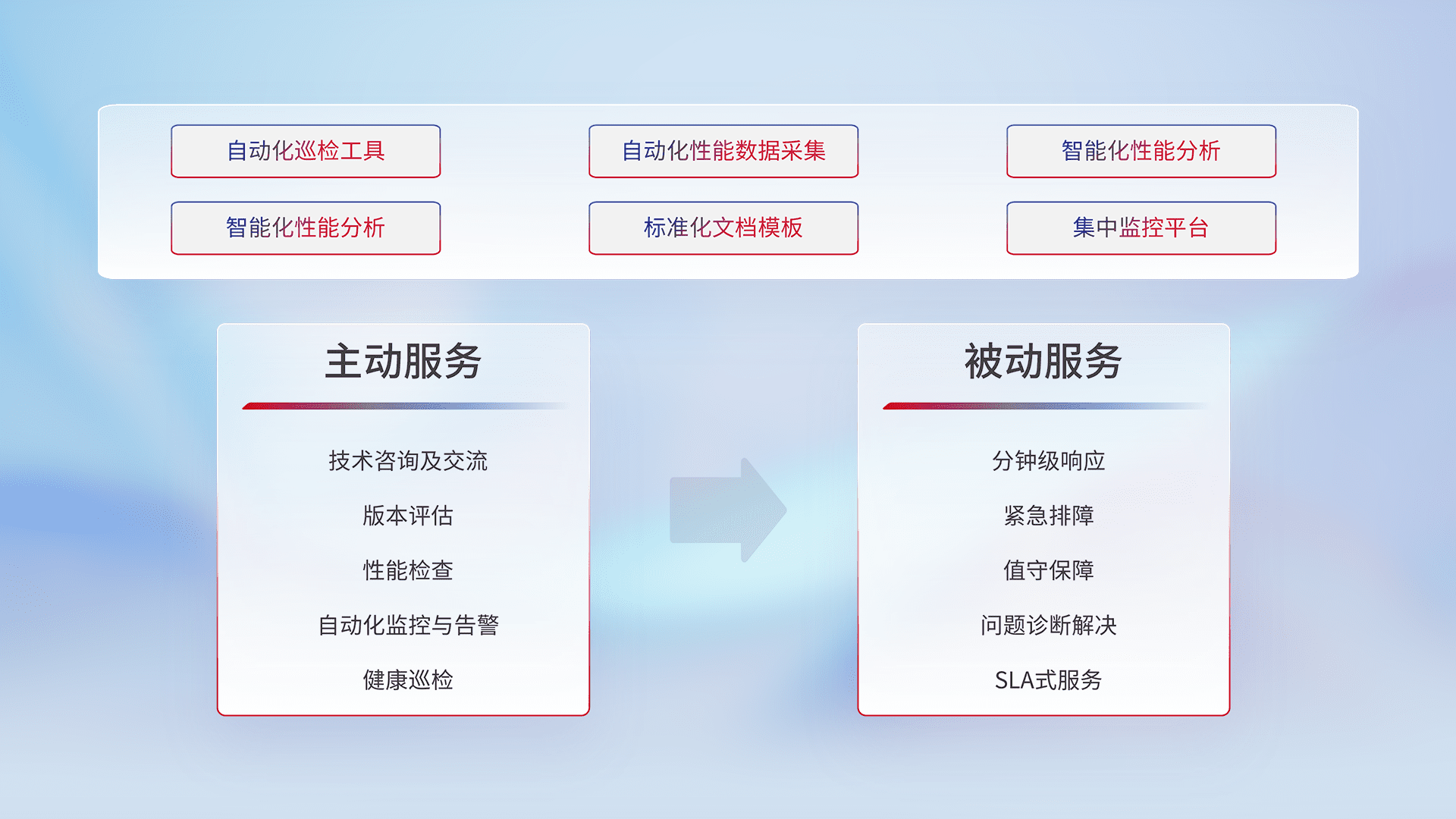 智能化工具和标准化文档,,保障服务质量,,,提供主动服务(包含技术咨询、、、版本评估、、性能检查、、、自动化监控与告警、、、健康巡检)和被动服务包含(分钟级响应、、、紧急排障、、、值守保障、、、、问题诊断解决、、SLA服务)。。